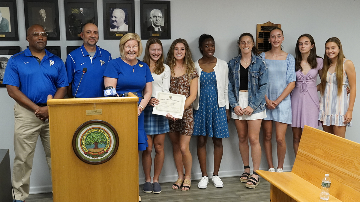 The Fanwood Borough Council and Mayor Colleen Mahr honored high school athletes’ achievements, passed the new budget and voted to adopt on first reading an amendment to the ordinance prohibiting dogs in Borough parks at the regular monthly Council meeting Monday, June 20, 2022. For the first time in recent history, the Council chamber was packed with spectators and reporters from three television stations.