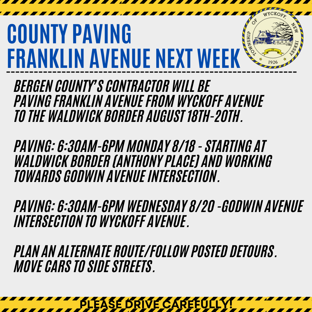 WYCKOFF, NJ — The town of Wyckoff will continue paving part of Franklin Avenue through Wednesday, they said.