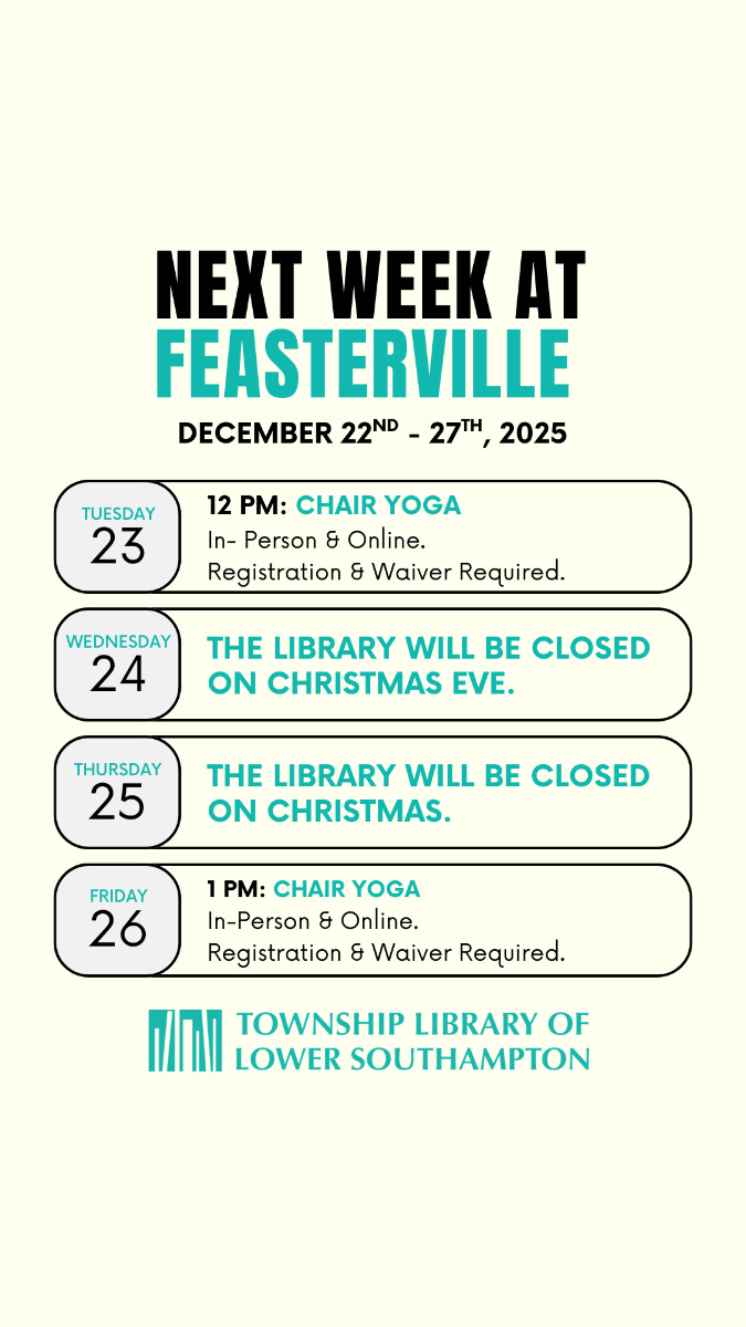 Lower Southampton|Local EventThis Week's Adult Programs at the Feasterville Library...Township Library of Lower Southampton, NeighborDec19Event DetailsFri, Dec 19, 2025 at 9:00 AMAdd to calendarFeasterville Library, 1983 Bridgetown Pike, Feasterville-Trevose, PA, 19053This Week's Adult Programs at the Feasterville Library Share