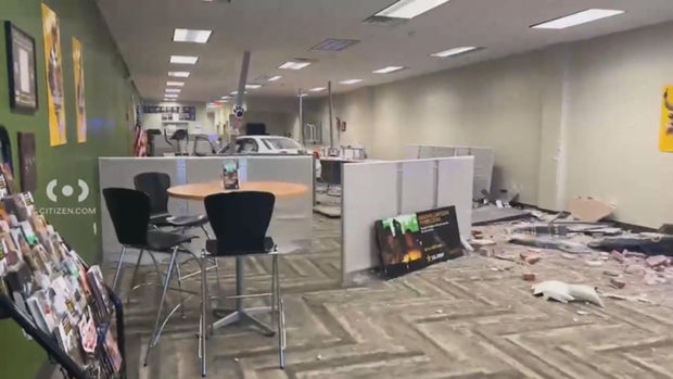 Video from Citizen shows the white Honda Civic the woman drove inside the building surrounded by debris. The woman was taken to the hospital with minor injuries, police said.