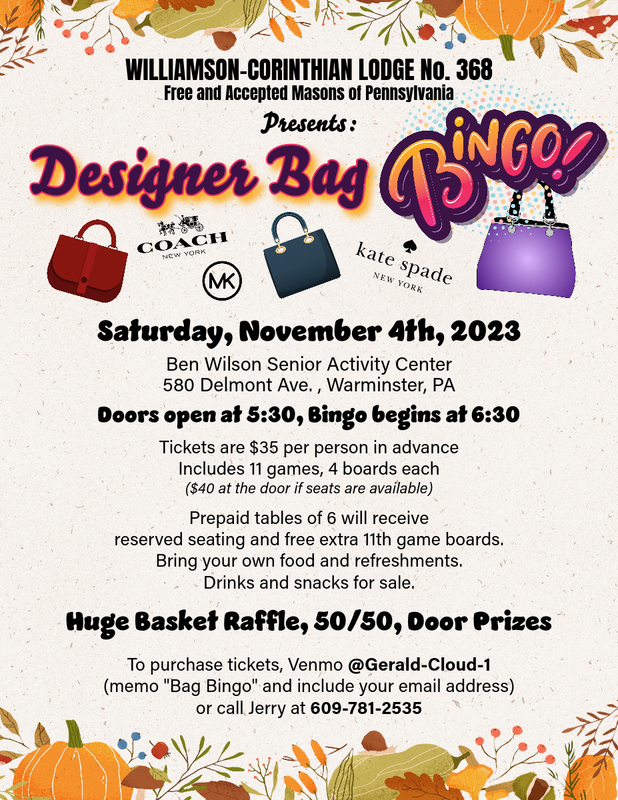 Bingo lovers aged 18-118 mark your calendar for 6:30p.m. on November 4, 2023, and get your tickets NOW. This Bingo event supports the Williamson-Corinthian Lodge No. 368 F&AM semi-annual Surprise Baby Shower for active military members and their families. Every penny of the proceeds will help us provide each family with a stroller, a car seat, a pack and play, baby monitors, diapers, clothing, and other essential baby items.