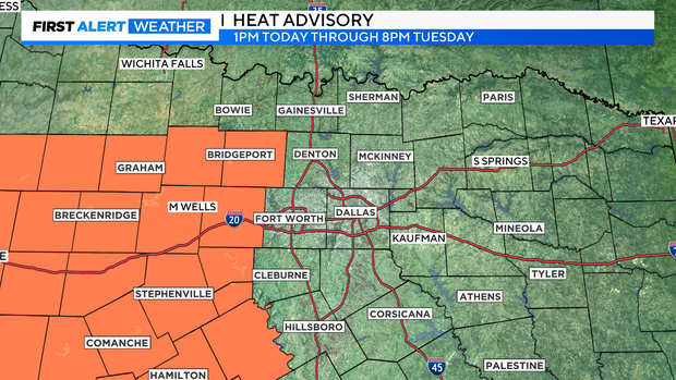 A heat advisory is in effect from 1 p.m. today through 8 p.m. Tuesday for areas west of I-35. High temperatures in those areas will be between 103 and 105, and it will likely feel hotter. Make sure you're taking breaks while outdoors, drink plenty of water and never leave your kids and pets in a hot car.