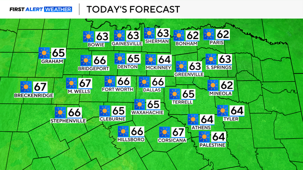 Expect a sunny and nice spring day ahead. North Texas will see temperatures in the mid-60s for highs today and thankfully, wind won't be as strong.