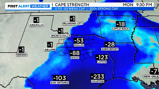 A severe thunderstorm warning was issued for Bosque, Erath, Hood, Somervell and Hamilton counties until 8:30 p.m. Monday, but loss of heating for the day and a stout cap over the Metroplex damped the storm's strength.