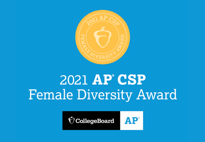 This award honors schools for expanding young women’s access to AP computer science classes. To be eligible for the award, the campus had to achieve either 50% or higher female exam taker representation in one of or both AP computer science courses